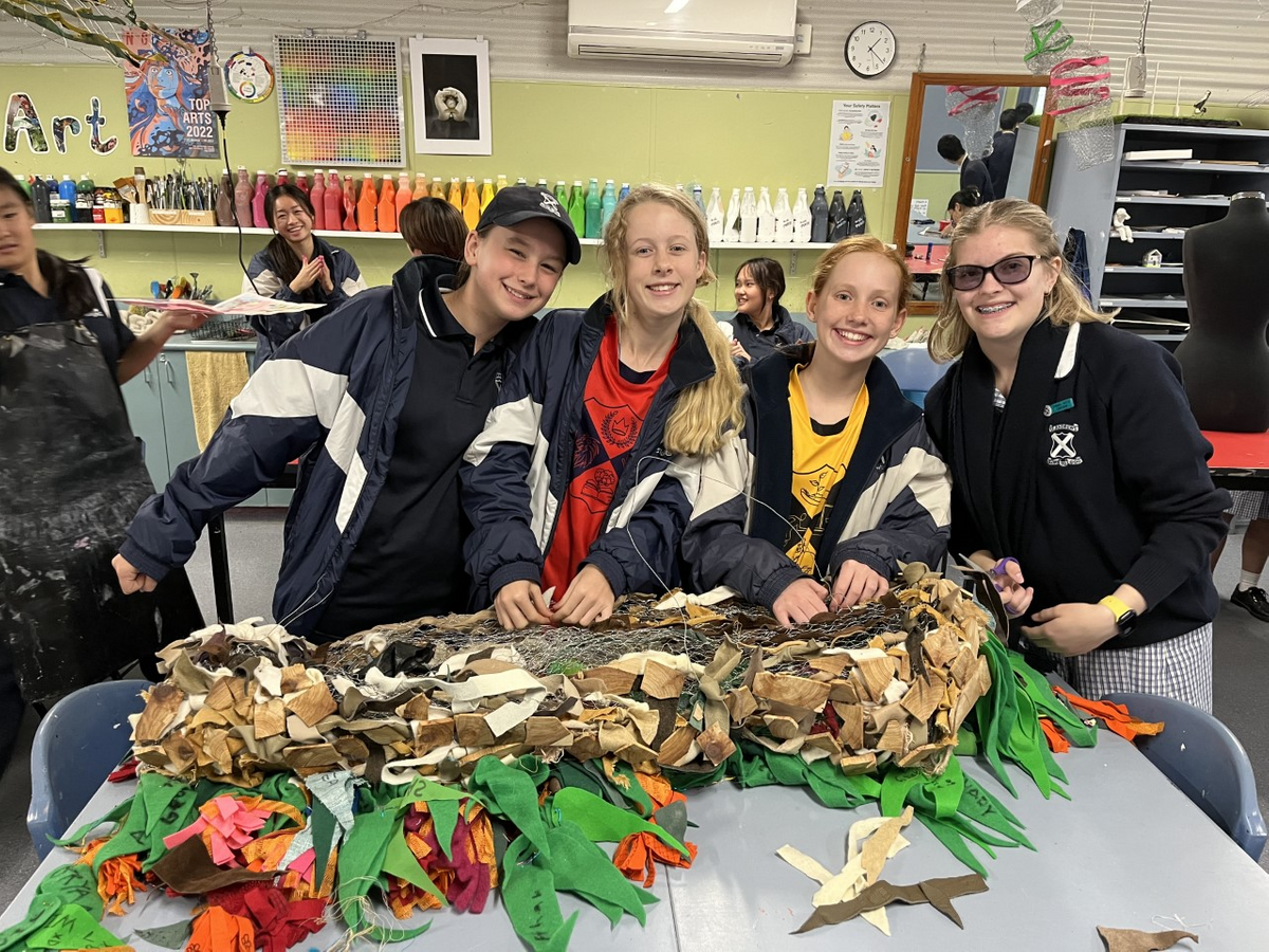 Pictured: Our Art Captain, Melanie, and Year 7 students constructing an ‘Upside Down Garden’ from recycled materials.