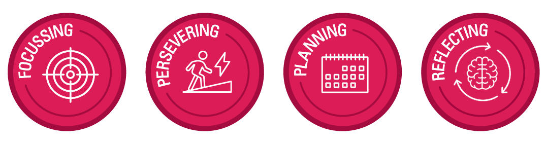 Planning enables students to organise their time and ideas effectively, while Focussing allows them to engage deeply with tasks and think critically. Persevering develops resilience, helping students overcome challenges with determination. Reflecting builds self-awareness, encouraging learners to recognise progress, learn from experiences, and make choices that enhance their wellbeing. These attributes are strongly linked to self-regulation and metacognition, which research consistently shows are key predictors of student success.