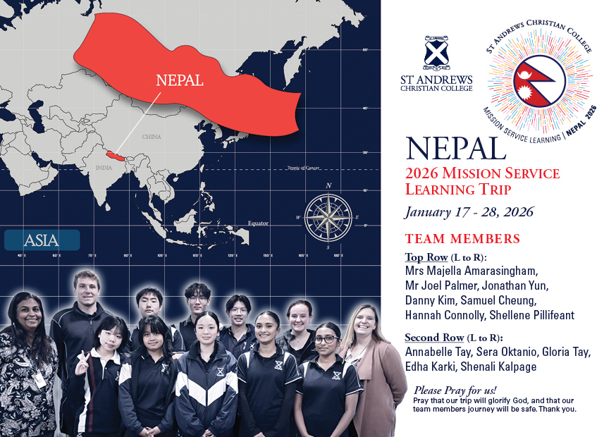 The team consists of staff members Mrs Majella Amarasingham, Mr Joel Palmer, and Mrs Shellene Pillifeant, along with students Samuel Cheung, Hannah Connolly, Shenali Kalpage, Edha Karki, Danny Kim, Sera Oktanio, Annabelle Tay, Gloria Tay, and Jonathan Yun. We sincerely thank our school community for their support and prayers as the team embarks on this incredible opportunity to serve and learn.